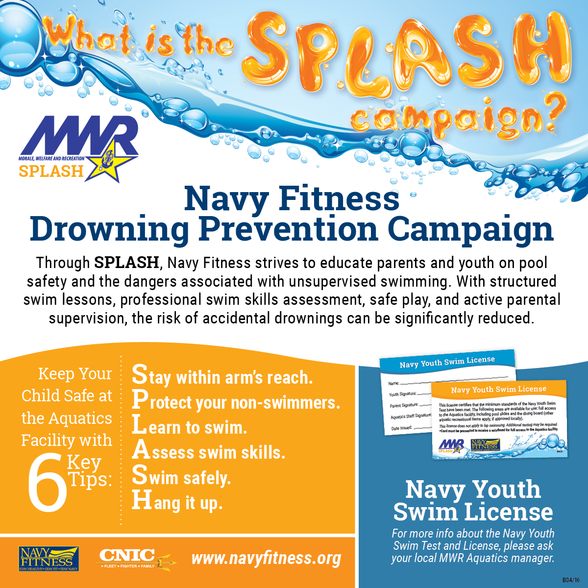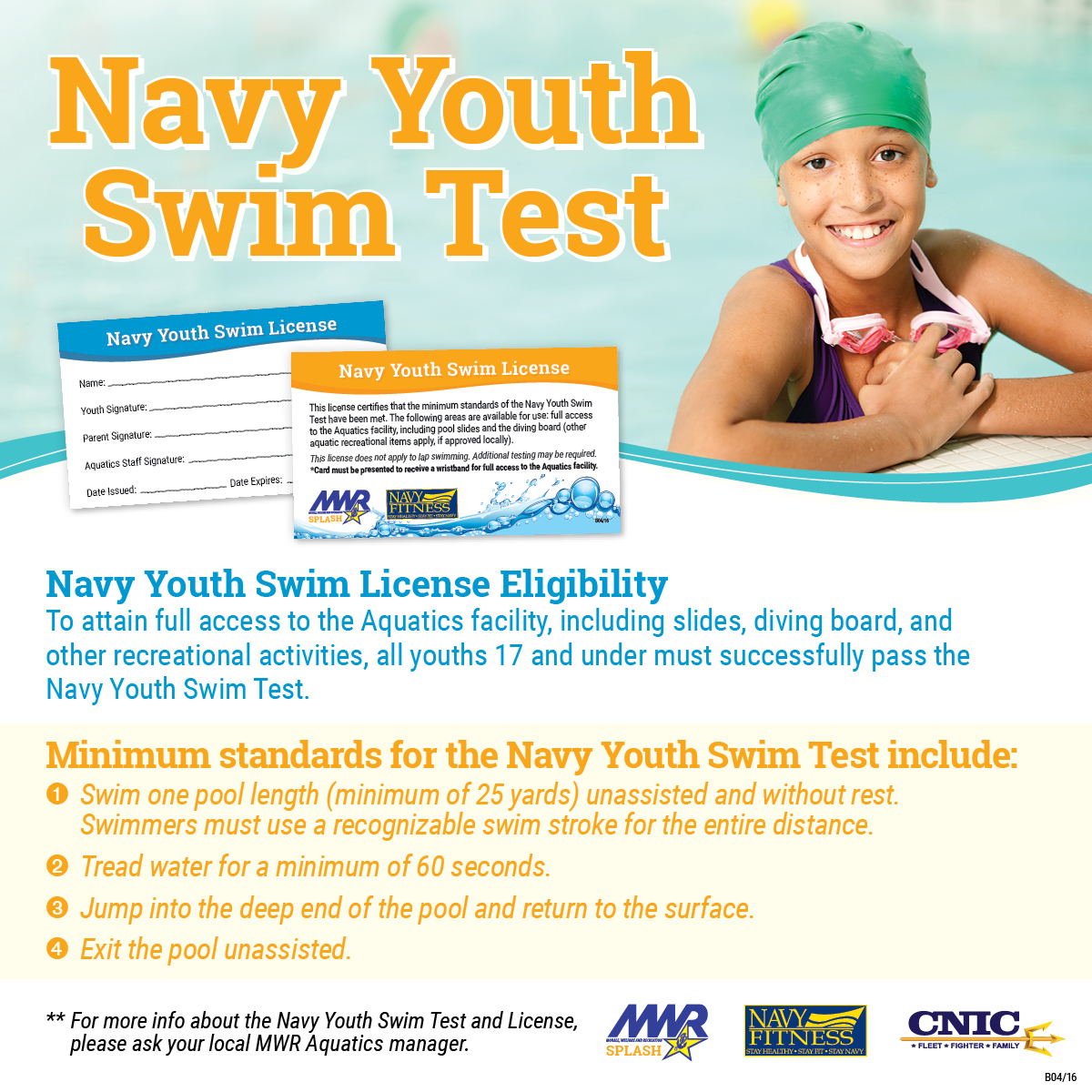 • All children 17 & under must take the Navy Youth Swim Test.